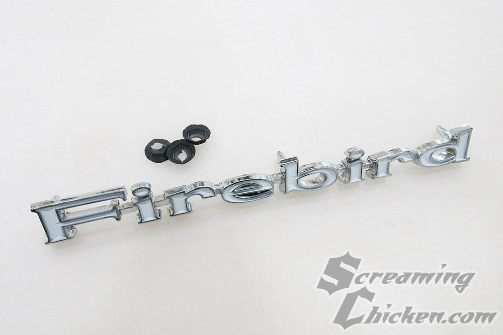 Firebird emblem was installed on all 1967-68 Firebirds. Replaces original GM part number 9789532. Emblem installs like the original with correct stud placement and includes hardware for an easy install. Product includes one emblem for price listed, two needed per car. Officially licensed by General Motors. Thinner than the 1969 emblem, but studs are in the same location and can be used on a 1969 if you want. Does not include the bird in front of the lettering.