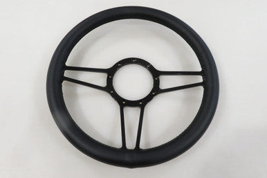 Steering wheel for 1969 Camaro/Firebirds & 1967-68 Camaro/Firebird with Ididit or Flaming River steering columns. Featuring full wrap over a 14" diameter black billet steering wheel. This steering wheel is just like the other wheel we sell except has thinner spokes. Unlike cheaper steering wheels this one features a full automotive grade leather wrap, some wheels only have a half wrap which becomes uncomfortable when the backside of the steering gets hot or cold. Optional steering wheel adapter and horn button fits GM Camaro/Firebird steering columns from 1969 or 1967-69 with Ididit and Flaming River columns. Will only install on 9 button steering column adapters. Adapter option includes black billet adapter to install on GM steering columns and horn button. Will not install on column without an adapter.