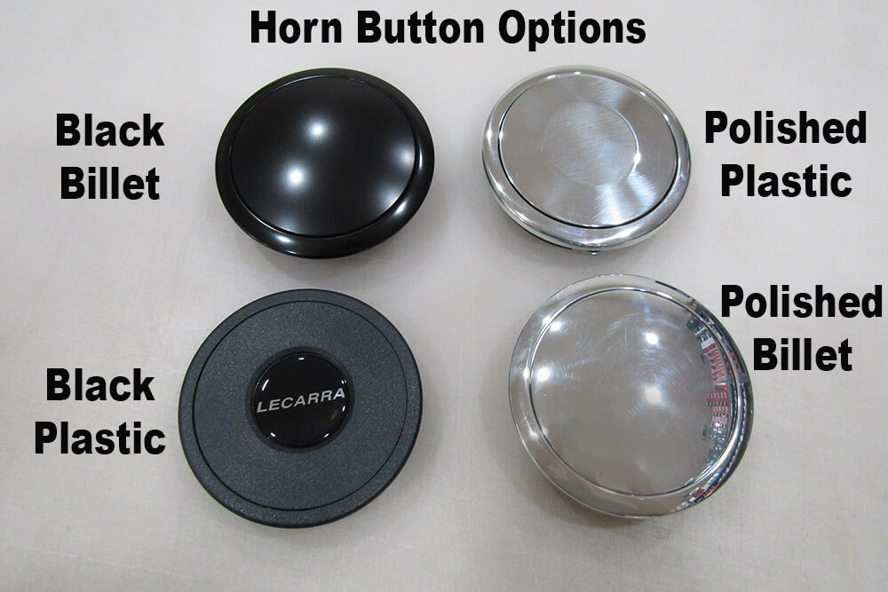 The Lecarra Mark 9 Steering Wheel measures 14 inches in diameter and has a 3-spoke design with an aluminum center and a black leather wrap. Available with polished or black billet spokes. The steering wheel has a 1 1/8 inch thick grip. Unlike lower-quality wheels that use partial leather wraps, this model features a full automotive-grade leather covering, ensuring consistent comfort regardless of temperature changes on the steering surface. Optional steering wheel adapter and horn button fits GM Camaro/Firebird steering columns from 1982-92. Optional adapter includes black billet adapter to install steering wheel and a choice of 4 different horn buttons with install hardware. Will only install on 9 button steering column adapters, will not install without an adapter. Made in the USA.