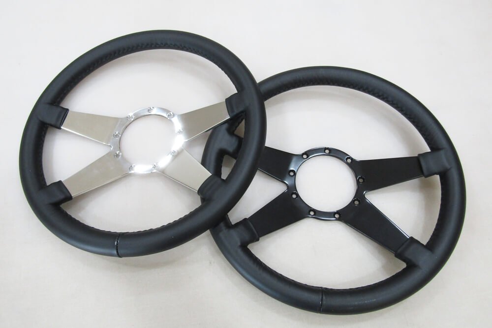 The Lecarra Mark 9 Steering Wheel measures 14 inches in diameter and has a 4-spoke design with an aluminum center and a black leather wrap. Available with black or chrome spokes. It offers a 1 1/8 inch thick grip, tailored specifically for 1982-92 Camaros and Firebirds. Unlike lower-quality wheels that use partial leather wraps, this model features a full automotive-grade leather covering, ensuring consistent comfort regardless of temperature changes on the steering surface. Optional steering wheel adapter and horn button fits GM Camaro/Firebird steering columns from 1982-92. Optional adapter includes black billet adapter to install steering wheel on GM steering columns and a choice of 4 different horn buttons with install hardware. Will only install on 9 button steering column adapters, will not install without an adapter. Made in the USA.