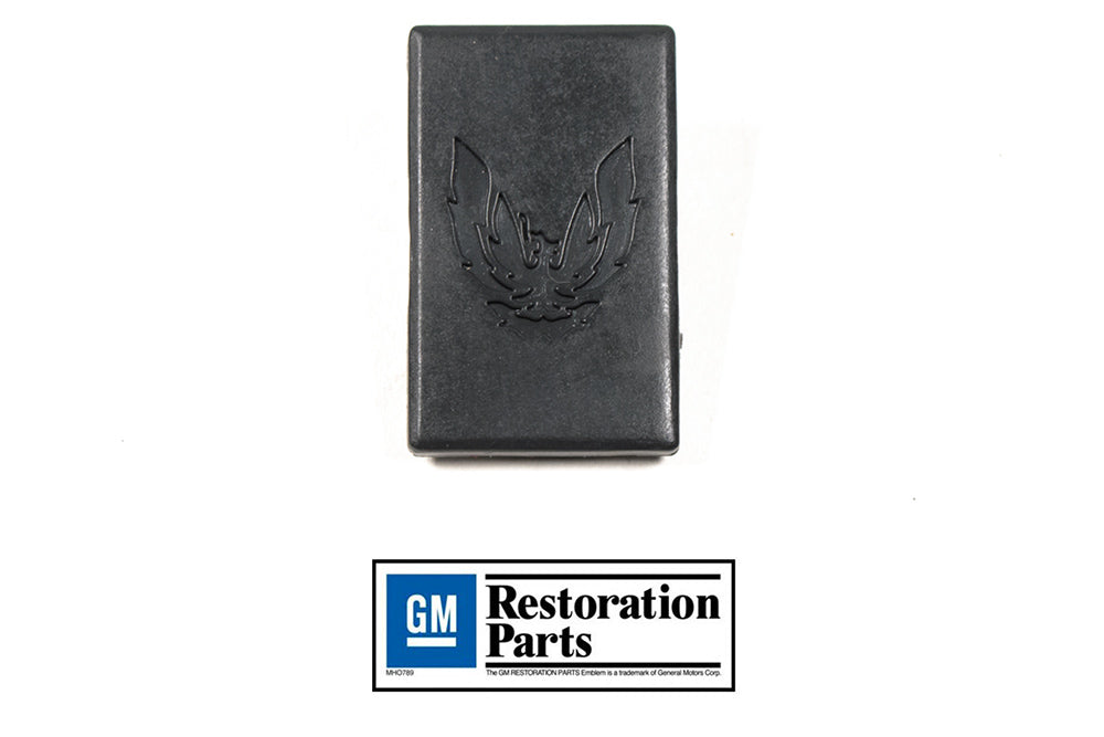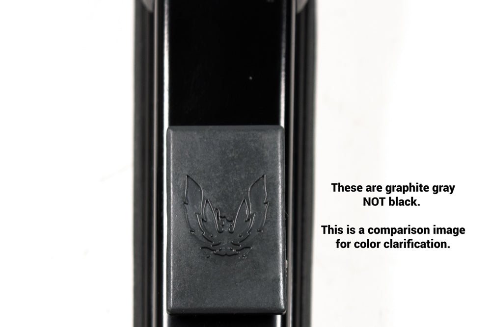 These door trim panel screw covers are officially licensed GM reproductions tailored for 1987–1992 Firebirds. They conceal the fasteners near the interior door handle while preserving an authentic OEM appearance. Featuring the accurate Firebird logo and finished in graphite gray to complement the original trim, these covers precisely replicate GM part number 20514714. Unlike generic black plugs, they meet OEM specifications and are sold as a pair, covering both driver and passenger sides under official GM licensing.