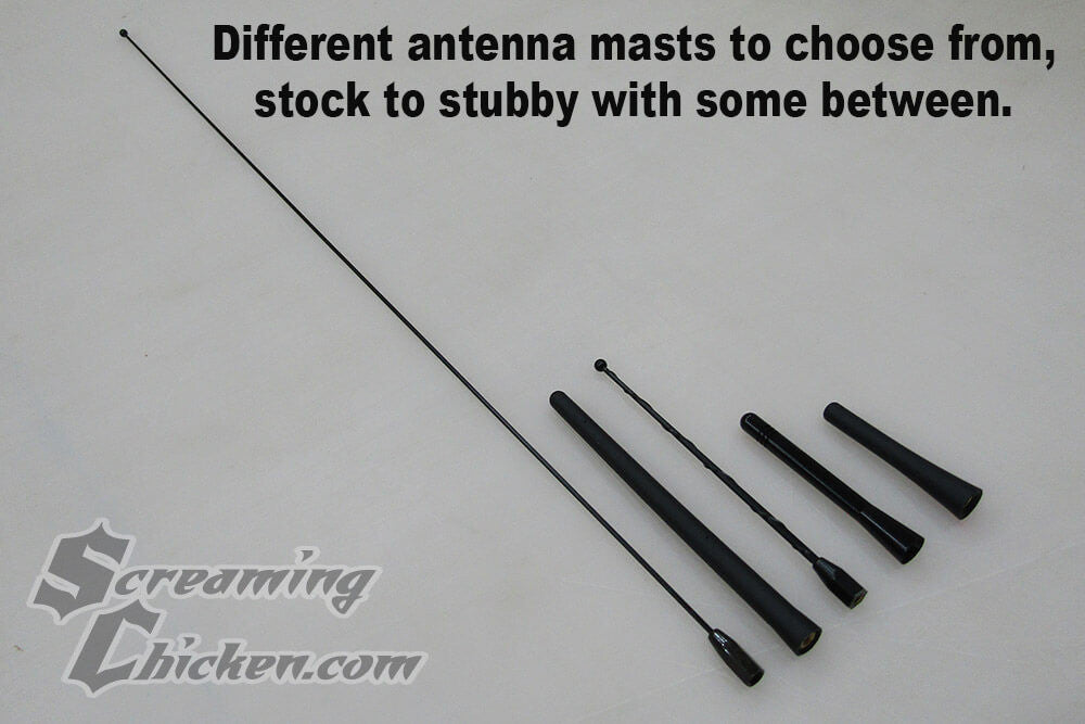 Includes a complete replacement antenna for 1993-2002 Camaros/Firebirds. Can be used to replace a broken manual or power antenna. Includes a factory style 32" tall antenna mast or swap for a shorter antenna mast in the options. Includes adapter so you can replace antenna from the rear of the car and won't have to run antenna cable to the radio for an easier install. Shorter antennas will hurt radio reception, of the short antennas available the 6.75" rubber antenna is the only one that is designed to maintain radio reception. Works great for 1993-95 cars that are not easy to find a new mast for.
